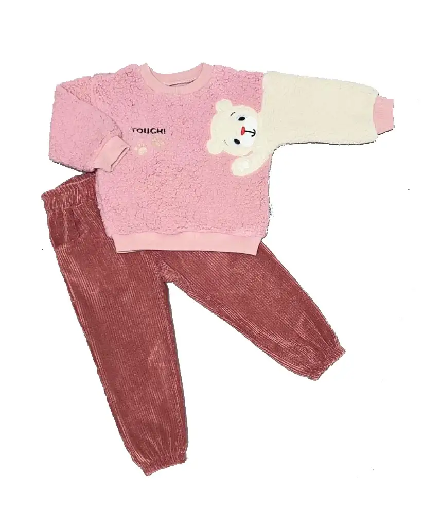 1-2-3 Ayıcık Kollu Kuzu Kumaş Sweat Kadife Pantolonlu Kız-erkek 2li Çocuk Takımı Gül Kurusu
