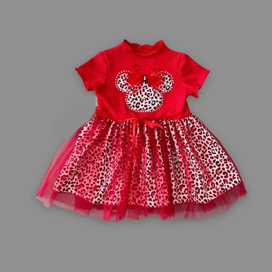 1-2-3 Yaş Fiyonklu Mickey Astarlı Etekli Kız Bebek Tütü Elbisesi Kırmızı