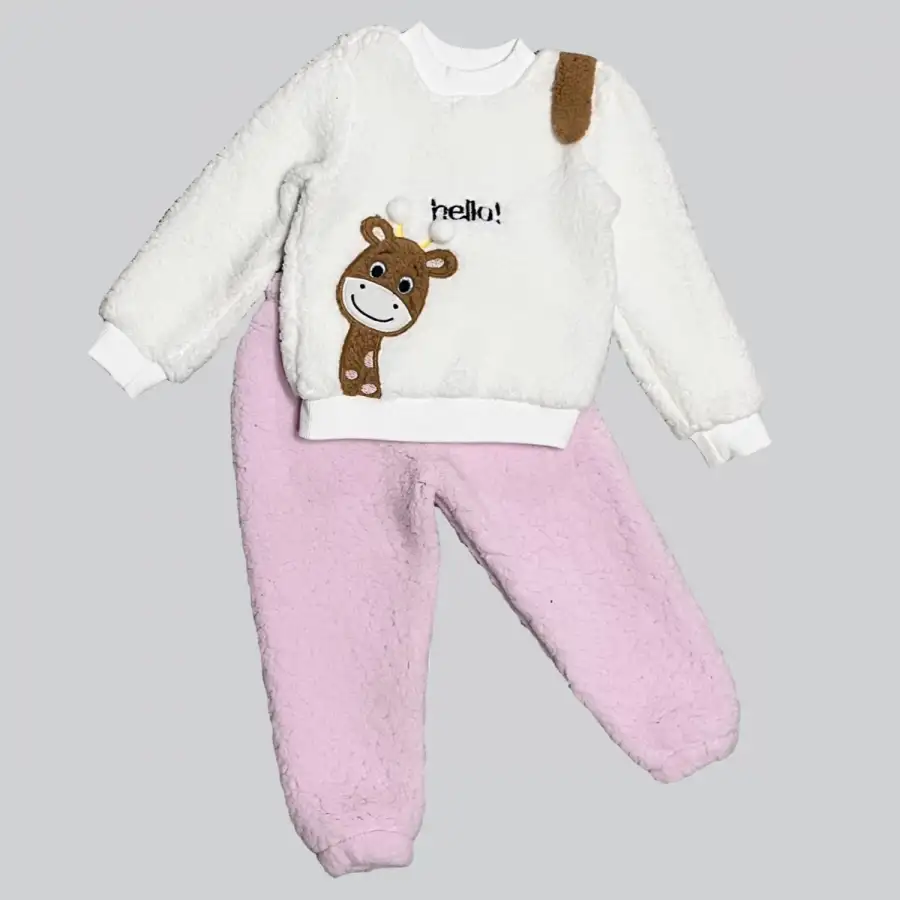 1-2-3 Yaş Hello Zürafa Nakışlı Kuzu Kumaş Sweat Pantolon Uzun Kollu Kız Erkek 2 Li Takımı Pembe
