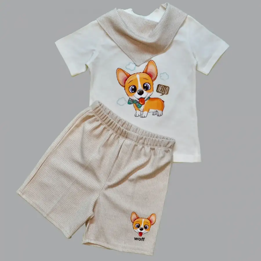 1-2-3 Yaş Köpekçik Baskılı Flarlı Şortlu Kısa Kollu Tişört 3lü Erkek Bebek Takımı Bej