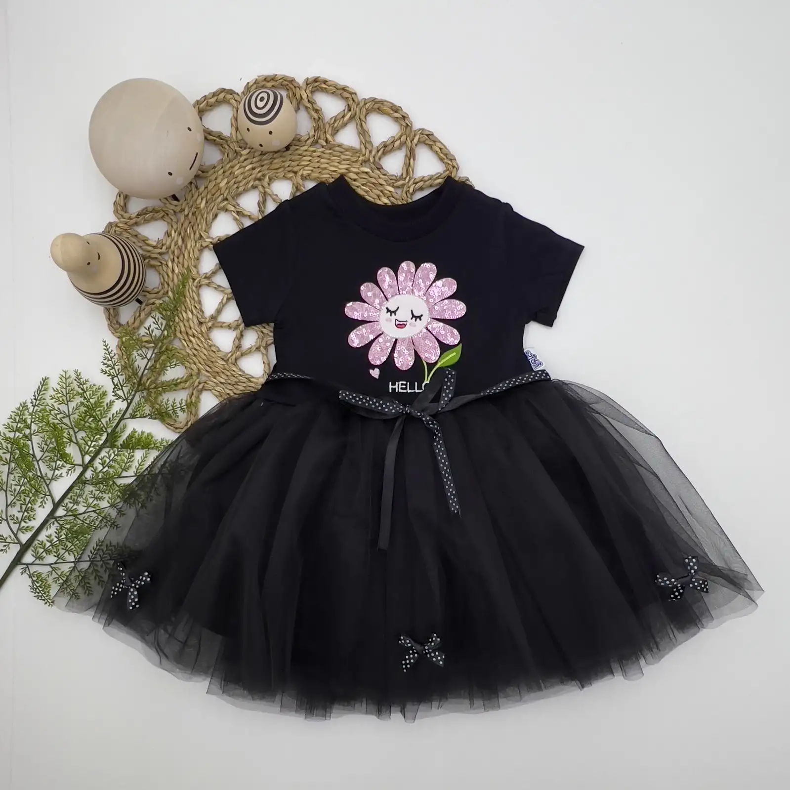 1-2-3 Yaş Payet Yapraklı Çiçek Nakışlı Astarlı Kız Bebek Tütü Elbisesi Siyah