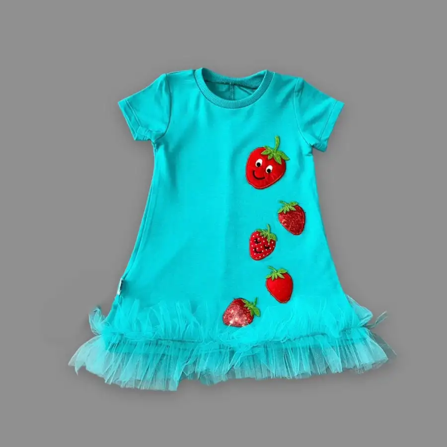 1-2-3 Yaş Payetli Çilekler Nakışlı Eteği Fırfırlı Jile Kız Çocuk Elbisesi Turkuaz