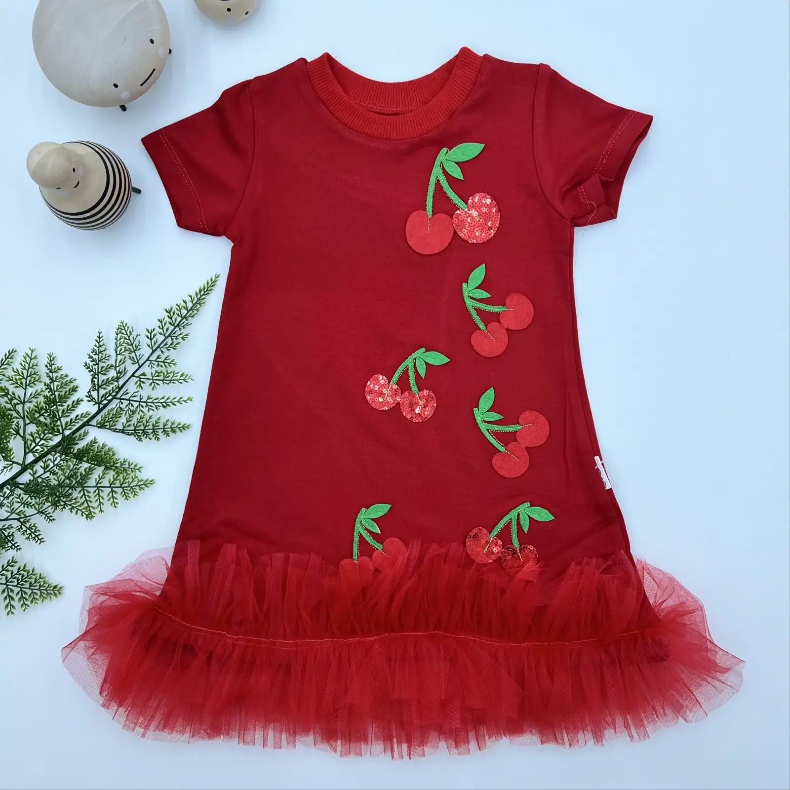 1-2-3 Yaş Payetli Kiraz Nakışlı Eteği Fırfırlı Jile Kız Çocuk Elbisesi Kırmızı