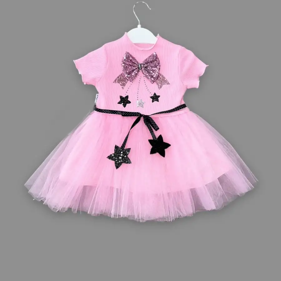 1-2-3 Yaş Payetli Yıldız Nakışlı Astarlı Etek Kız Bebek Tütü Elbisesi Pembe