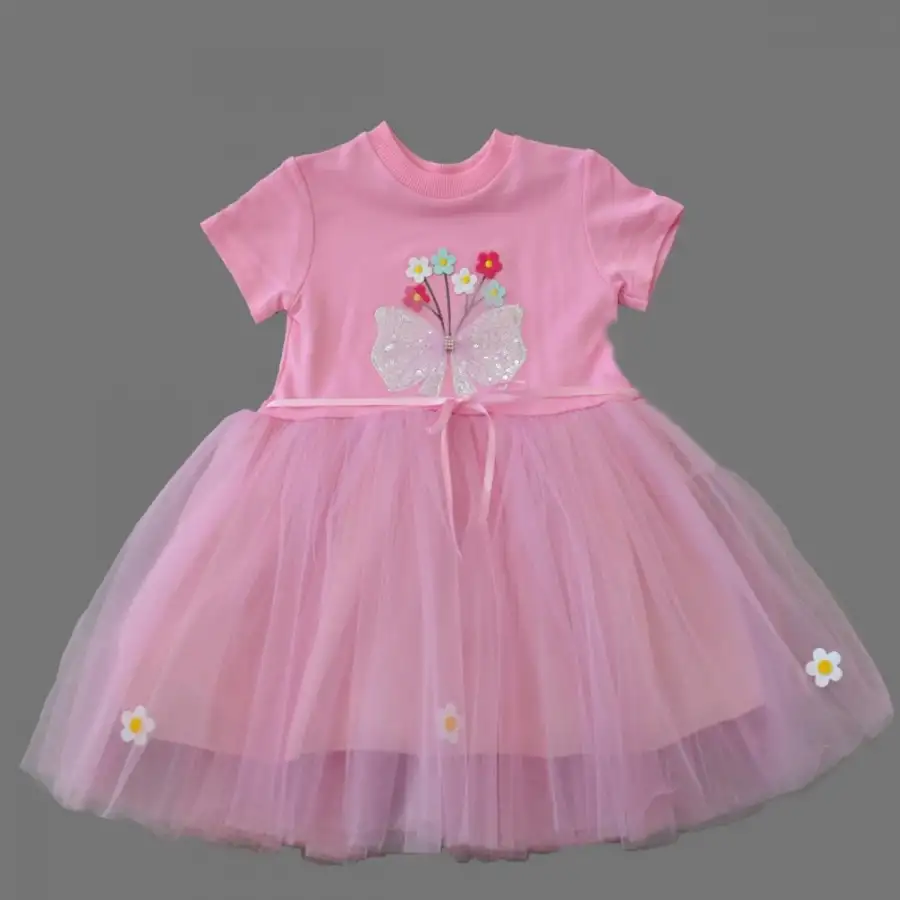 1-2-3 Yaş Tül Fiyonk Çiçekler Nakışlı Astarlı Kız Bebek Tütü Elbisesi Pembe