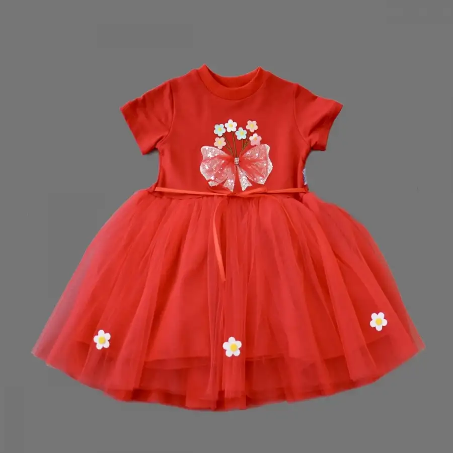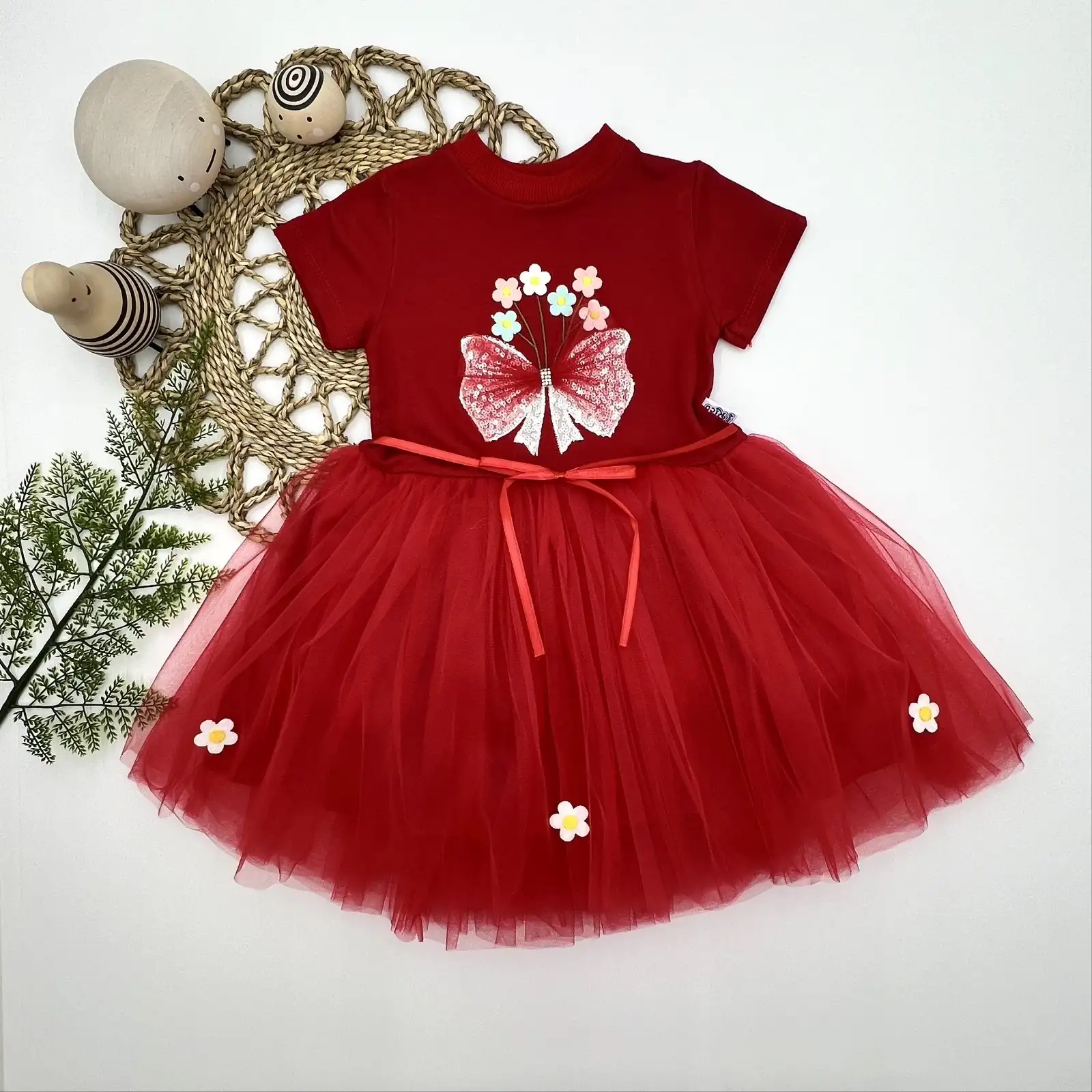 1-2-3 Yaş Tül Fiyonk Çiçekler Nakışlı Astarlı Kız Bebek Tütü Elbisesi Kırmızı