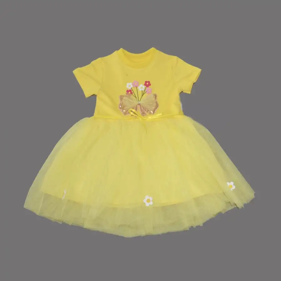 1-2-3 Yaş Tül Fiyonk Çiçekler Nakışlı Astarlı Kız Bebek Tütü Elbisesi Sarı