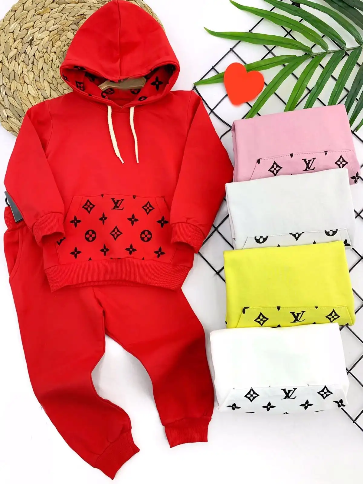 2-3-4-5 Yaş Kapşonlu Cep Detaylı Uzun Kollu 2li Kız Erkek Çocuk Takımı Kırmızı