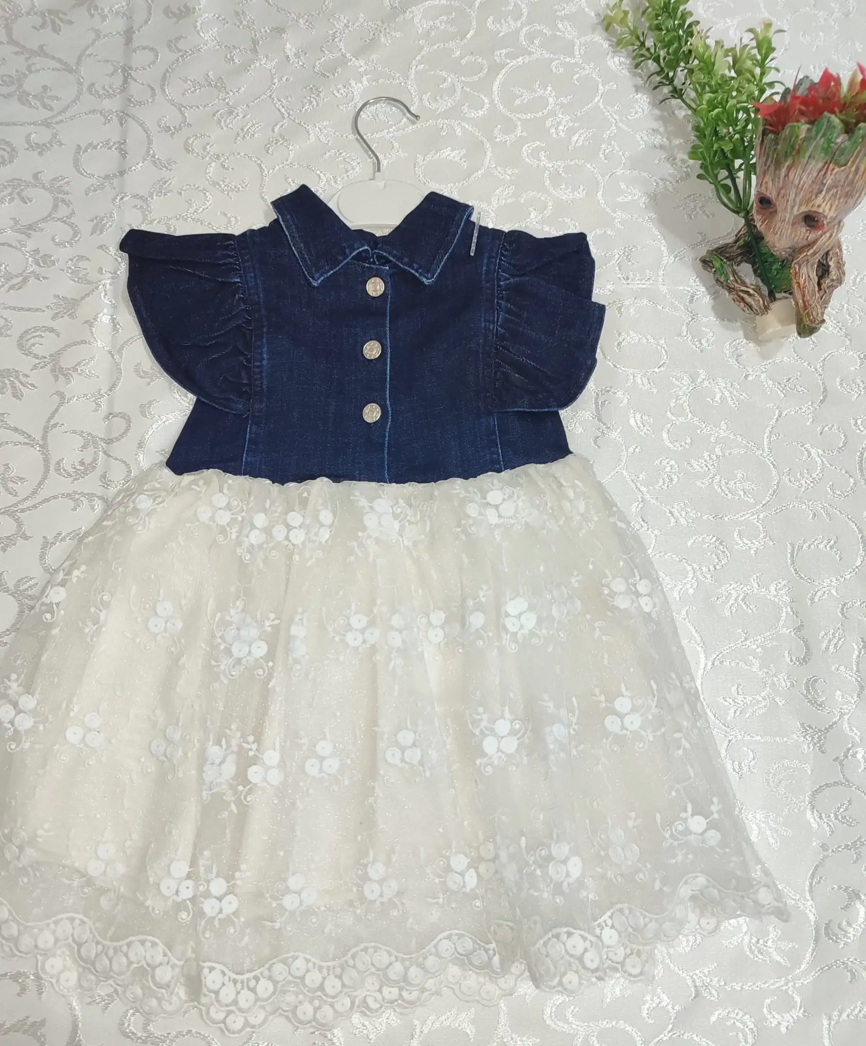 2-3-4 Yaş Astarlı Brode Etekli Kot Kumaş Düğmeli Kız Çocuk Elbisesi Mavi