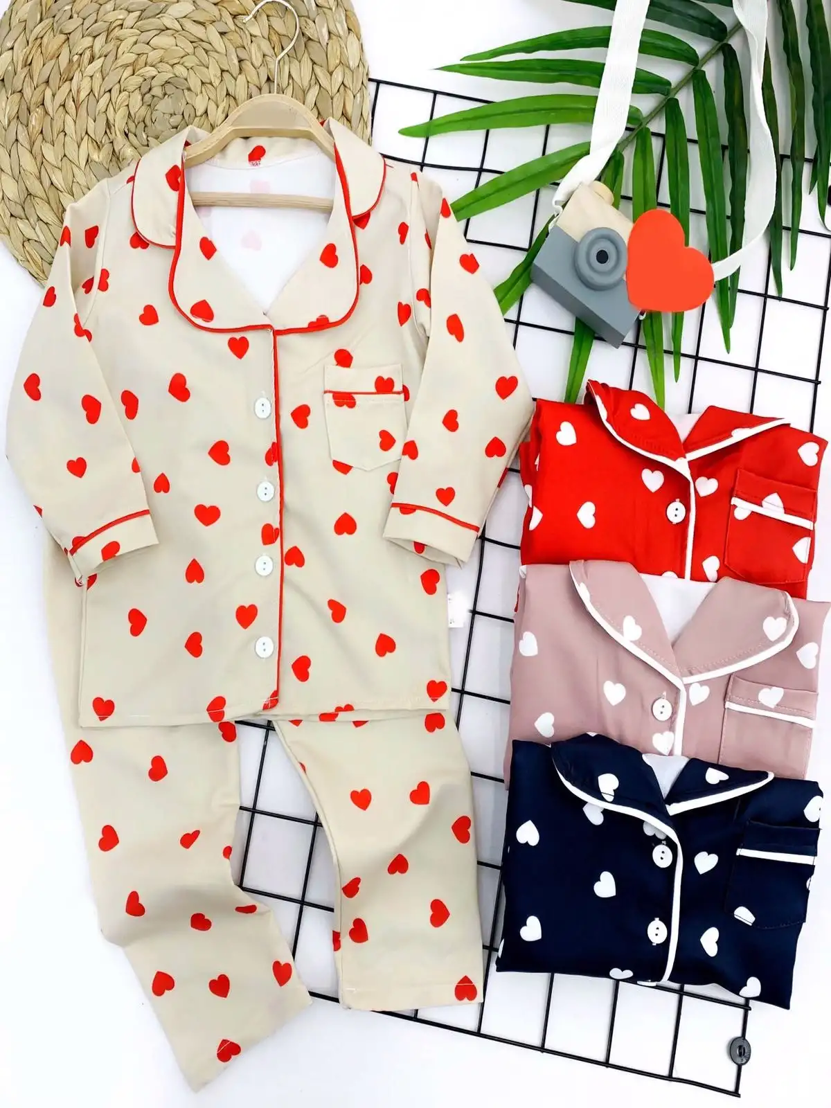 3-4-5-6 Yaş Kalp Baskılı Düğme Kapamalı 2li Kız Çocuk Pijama Takımı Lacivert