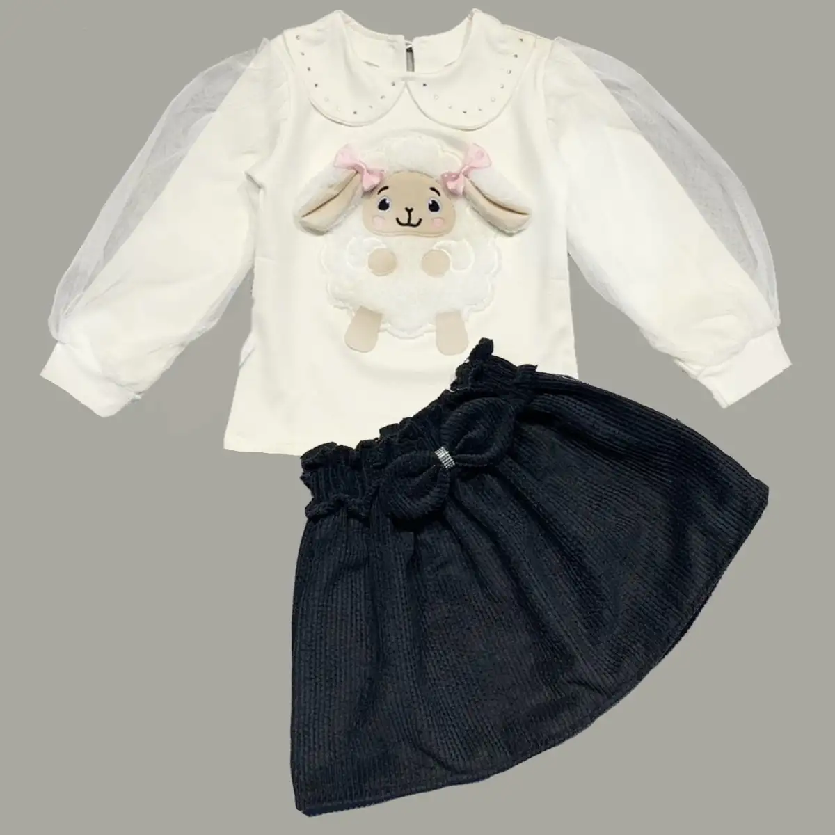3-4-5 Yaş Fitilli Kadife Etekli Tüllü Ve Uzun Kollu Kuzu Nakışlı Sweat 2li Kız Çocuk Takımı Siyah