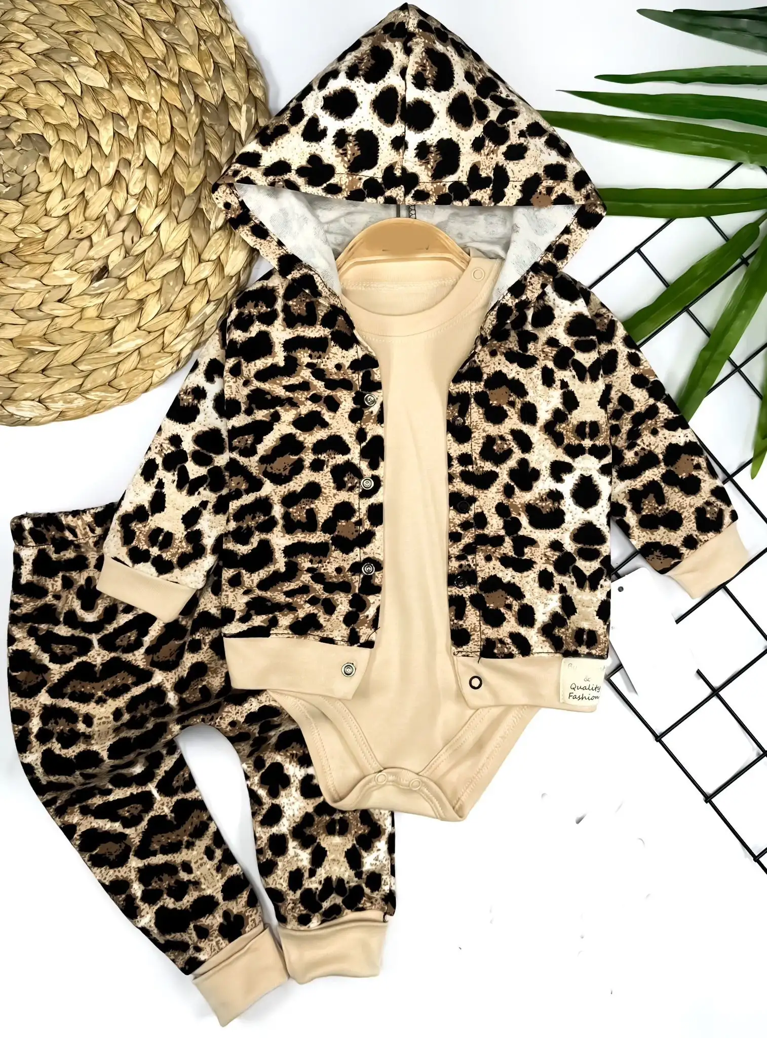 3-6-9-12 Ay Leopar Desenli Kapşonlu Zıbın Sweatli Uzun Kollu Kız Bebek Takımı Kahverengi