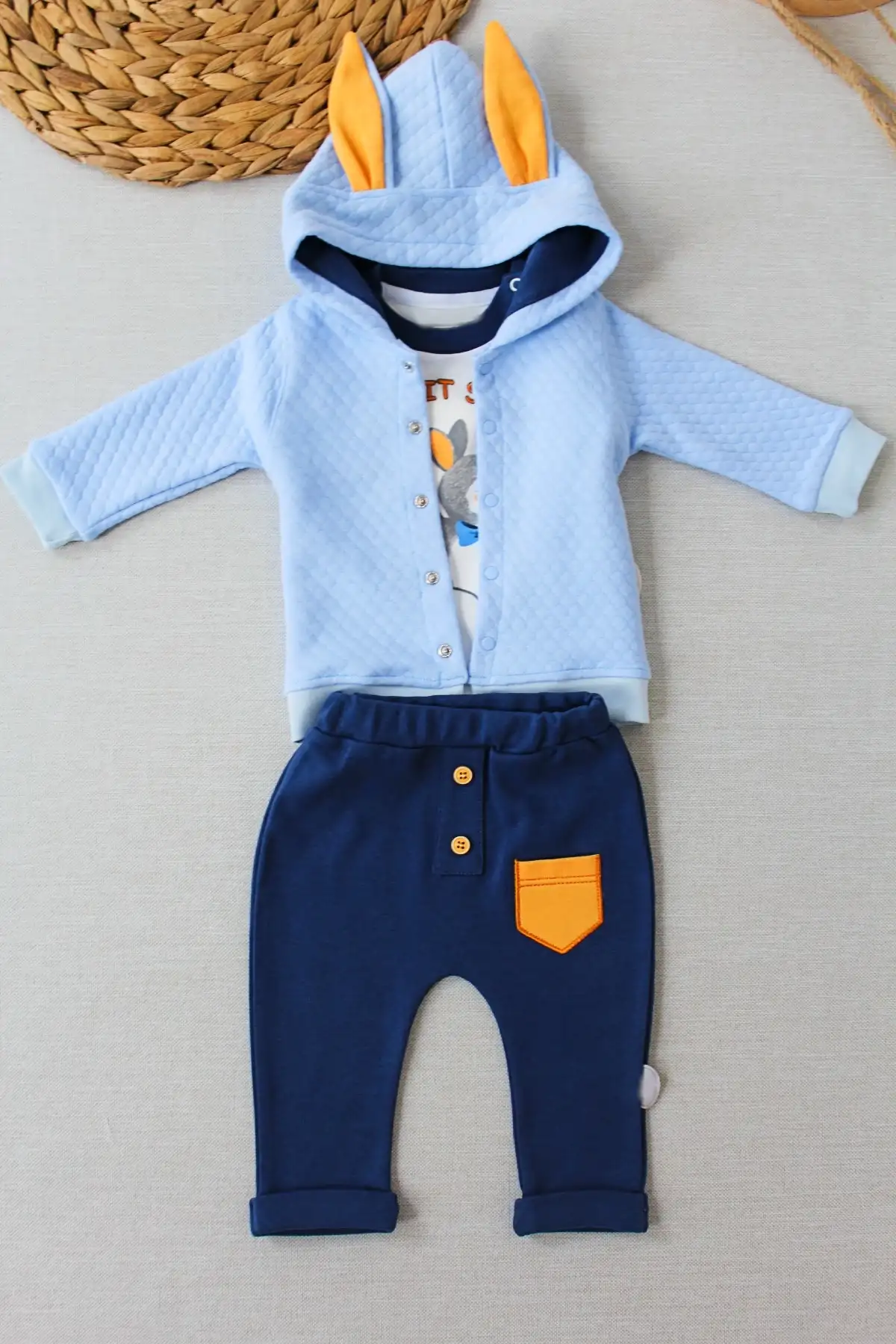 6-9-12 Ay Rabbit Şhow Nakışlı Kapşonlu Ceket Uzun Kollu Sweat Erkek Bebek 3lü Takım Mavi