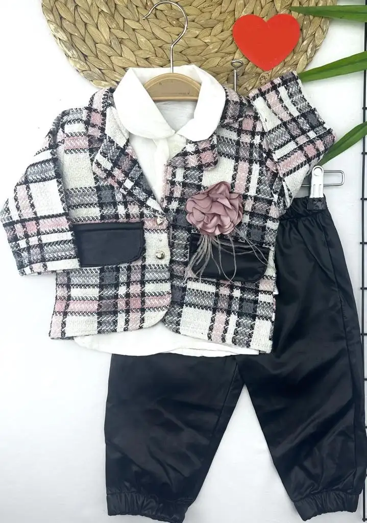 9-12-18-24 Ay Yaka Gül Detaylı Cepli Ceketli Uzun Kollu Örme Kumaş Kız Bebek Takımı Siyah