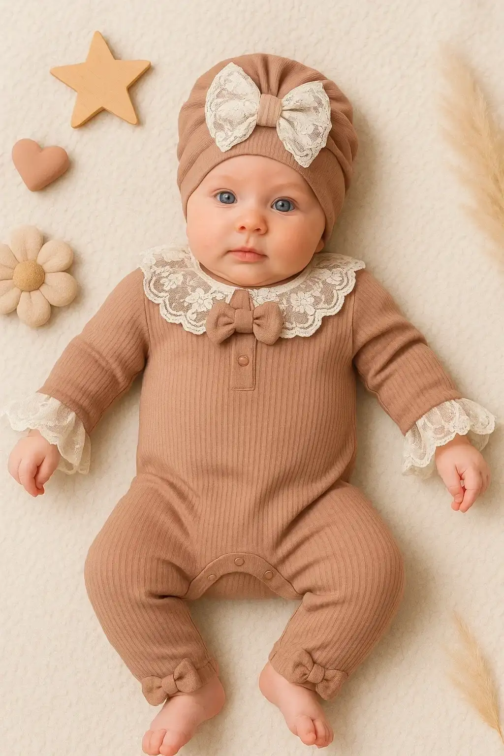 Dantel Yaka Detaylı Şapkalı 2'Li Kız Bebek Tulum